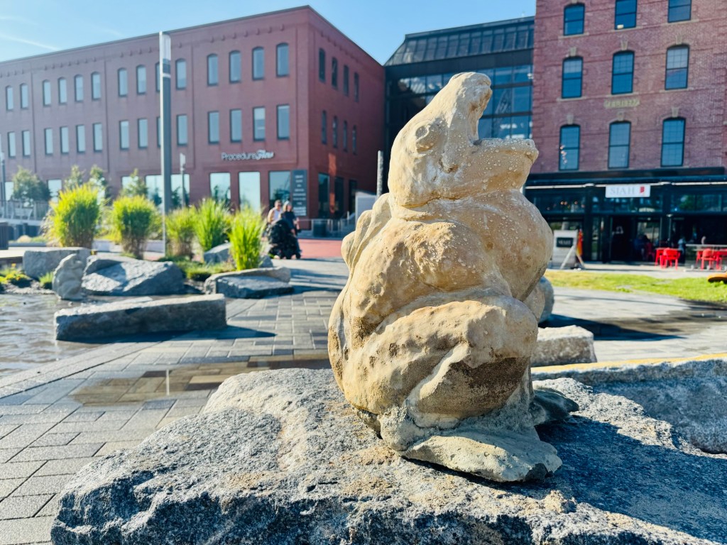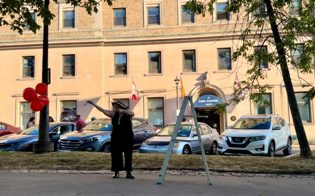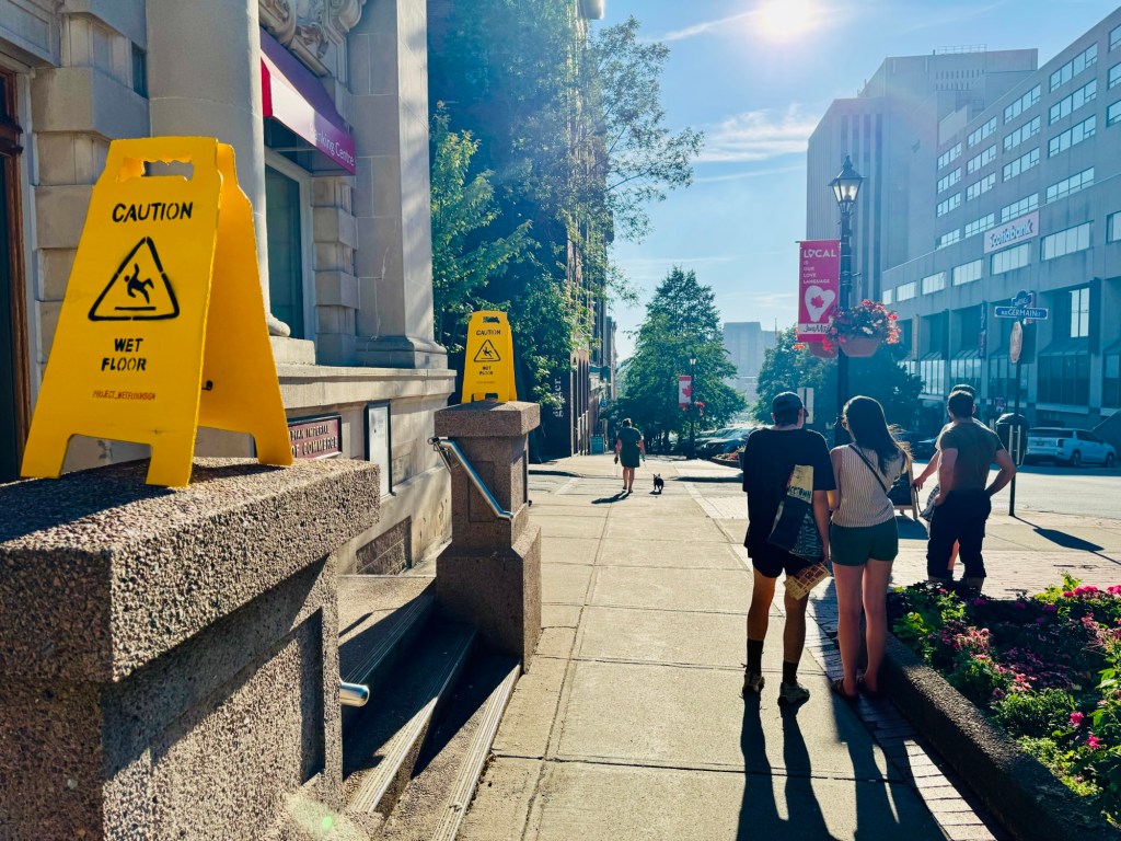 A week later, I volunteered a few hours of a Saturday night to Third Shift, a contemporary art festival that turns the nooks of uptown Saint John into exhibition spaces. A focal point of the festival is the titular “Third Shift“, wherein installations and performances pop up on sidewalks, public parks, alleys and door ways. During this event, passerby are both viewer and creator of art, e.g., punching bags become journals of worries and fears to then be knocked about; a tent surrounded by netting slowly becomes a woven tapestry of the community’s whims; a suited man with a bag over his head, eyeholes cut out, holds debates. The process brings folks together and etches something in the collective memory that transcends the digital ephemera.